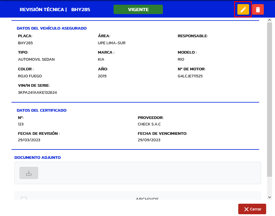 Nos mostrará un modal con los datos de revisión técnica, en el cual seleccionaremos la opción