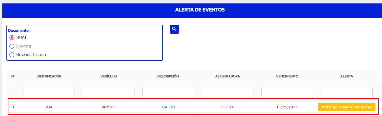 - Nos mostrará la lista de alertas de SOAT: